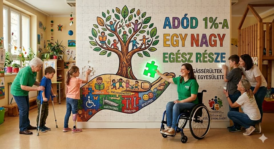 Adód 1%-a nem tűnik nagy összegnek, de ha felajánlod a Mozgássérültek Budapesti Egyesülete számára, akkor ez az összeg részévé válik egy nagy Egésznek, mert mint egy puzzle aprócska, de fontos elemeiből, úgy épül fel ezekből az adományokból a mozgássérültségben érintett gyermekek, fiatalok iskolai segélye, valamint számos szemléletformáló eszköz és mindezek útján az esélyegyenlőség.